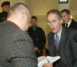 Der Verhandlungstag begann mit einer spektakulären Aktion: Auf Grund eines Versäumnisurteils vom Oktober des vergangenen Jahres, beantragt vom Linzer Anwalt Albrecht Zauner, wurde bei US-Anwalt Ed Fagan eine Taschenpfändung vorgenommen. Der amerikanische Advokat, der in den USA Angehörige von Opfern vertritt, händigte unter Protest dem Gerichtsvollzieher vor dem Saal zwei Zehn-Dollar-Scheine, einige Münzen und eine Uhr aus.